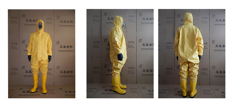 防化服是由防霧視窗及頭罩、連體衣褲、防化膠靴、雙防護腕、防化手套、雙密封拉鏈及水密封拉鏈組成的連體式服裝,使用時與正壓式消防空氣呼吸器配合使用。