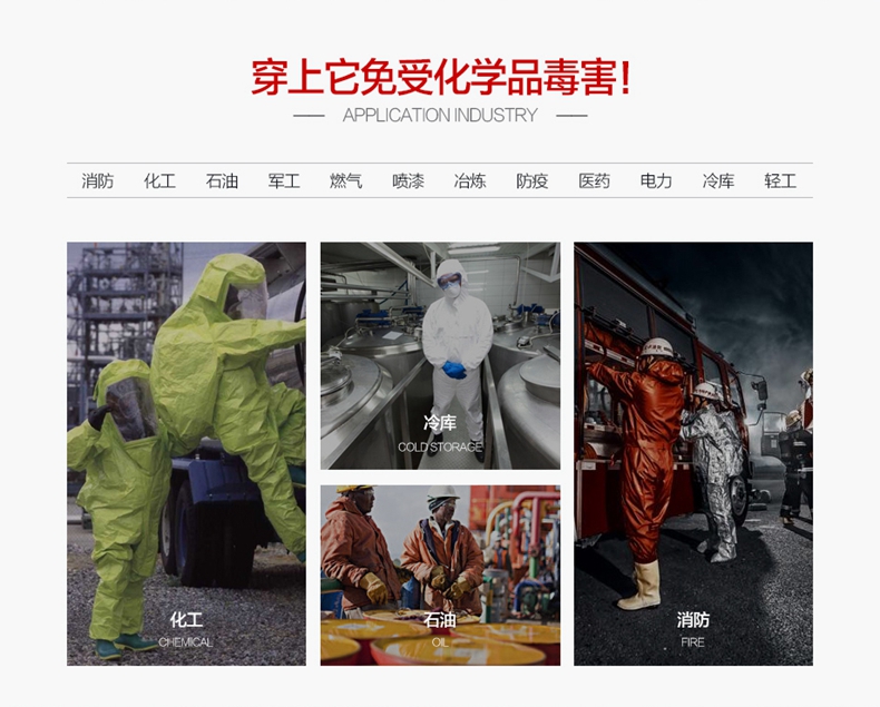防化服是由防霧視窗及頭罩、連體衣褲、防化膠靴、雙防護(hù)腕、防化手套、雙密封拉鏈及水密封拉鏈組成的連體式服裝,使用時(shí)與正壓式消防空氣呼吸器配合使用。
