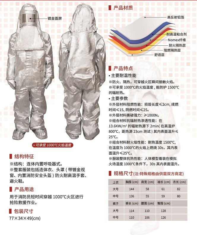 產(chǎn)品簡(jiǎn)介:高溫隔熱服是由纖維織物與鍍鋁薄膜的復(fù)合材料制作而成,服裝包括上衣、褲子、手套、頭罩和護(hù)腳,具有重量輕、阻燃、耐高溫、抗熱輻射、耐磨、耐折等優(yōu)點(diǎn)。能有效的保障消防隊(duì)員和高溫作業(yè)人員不被烈焰高溫灼傷。
